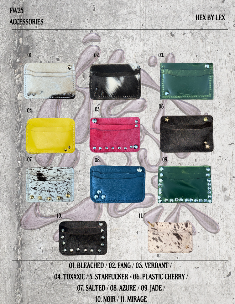 A capsule of eleven one-of-one wallets, each constructed from cowhide, rivets, and grain leather. Objects torn from the border of utility and desire, carried as weapons, charms, and proofs of existence.