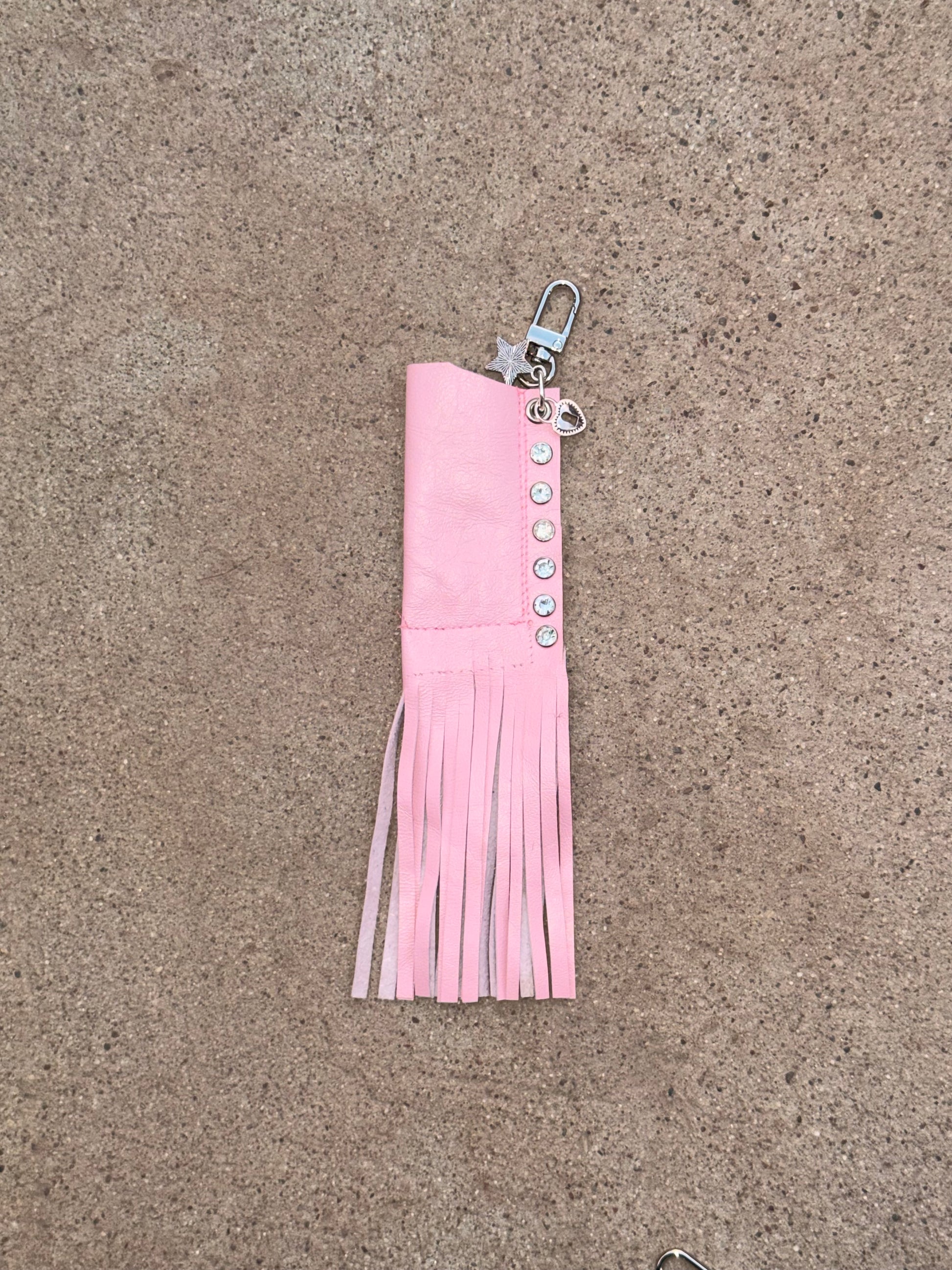 Baby pink leather fringe lighter case with charms and keychain attachment